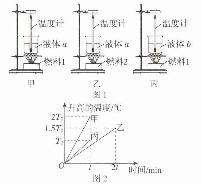 4. [2024·苏州模拟]如图1所示,用完全相同的装置利用燃料燃烧加热液体。已知燃料的质量、烧杯内的液体质量、加热方式等均相同,不计热量损失,将燃料点燃直至燃尽,甲、乙、丙三套装置的烧杯中液体升高的温度随时间变化的图像如图2所示,则下列说法错误的是(