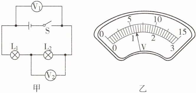 8. 如图甲所示电路中,当闭合开关S后,两个电压表指针偏转均如图乙所示,则灯泡$L_{1}和L_{2}$两端的电压分别为(