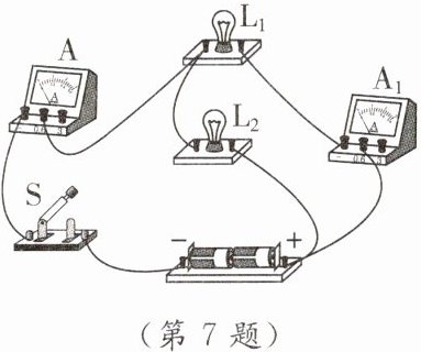 7. 如图所示的实验电路,闭合开关S后,电流表A的示数为0.5A,电流表$A_{1}$的示数为0.3A。下列说法正确的是(