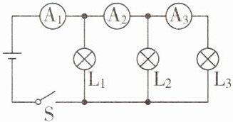 4. 如图所示,当开关闭合时,电流表$A_{1}$、$A_{2}$、$A_{3}$的示数分别为1.2A、1A、0.6A,则通过$L_{1}$的电流是
