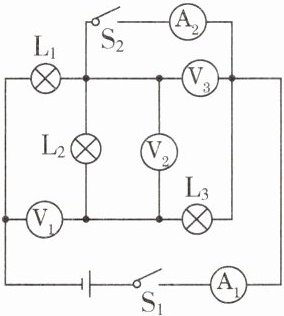 14.(科学推理)[2025·苏州月考]如图,先只闭合开关$S_{1}$时,电压表$V_{1}$、$V_{2}$、$V_{3}$的示数分别为3V、1V、4V,电源电压为