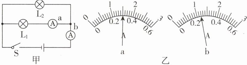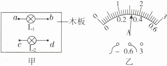 (2)第二组同学用第二块木板,在电源和开关之间串联接入电流表,闭合开关,两灯都发光,电流表示数如图乙所示,通过$L_{1}$的电流可能是____