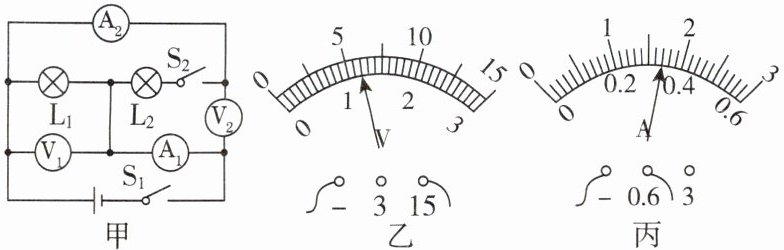 V,电流表$A_{1}$的示数如图丙所示为0.34