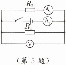 5. [2024·泰安改编]如图所示电路,电源电压保持不变。闭合开关后,电路中各元件正常工作,两个相同的电流表(均有0~0.6A,0~3A两个量程)指针偏转的角度相同。一段时间后电流表$A_1$指针偏转的角度突然变为原来的1/5,若元件$R_1$或$R_2$出现了断路故障,其他元件均完好。针对故障电路的观察分析,下列说法正确的是 (