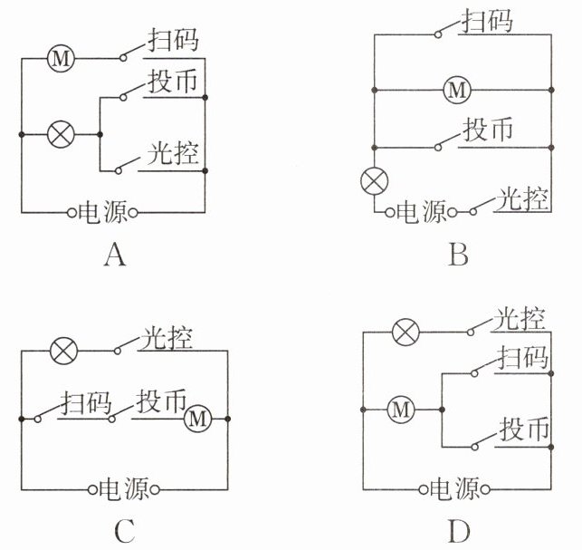 4. (国家政策)[2024·广安]党的二十大报告指出“必须坚持科技是第一生产力”。某学校为了培养学生的科学素养,开展了STEM科创教育,在此期间,科创小组自制了“冰淇淋自动售货机”。该作品可以通过扫码(该开关闭合)或投币(该开关闭合)完成自动出售服务;当光线较暗时,光控开关闭合,还可以提供照明。下列电路设计符合该要求的是 (
