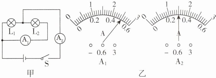 10. 某同学在做“用电流表测量电流”的实验中所用的电路如图甲所示,他按电路图正确连接电路并接通开关S后,电流表$A_1、$$A_2$的指针位置如图乙所示,则电流表$A_2$的示数应是