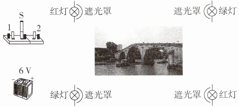 12. (古代建筑)京杭大运河上的古桥——拱宸桥两侧,安装了全国首个水上红绿灯,实现同一时间段内仅让船舶单向通过桥洞。图中电源电压恒为6V,四盏灯的额定电压均为6V,开关S中央的金属片自动与触点1、2、1、2……接触。请以笔画线代替导线完成电路连接。