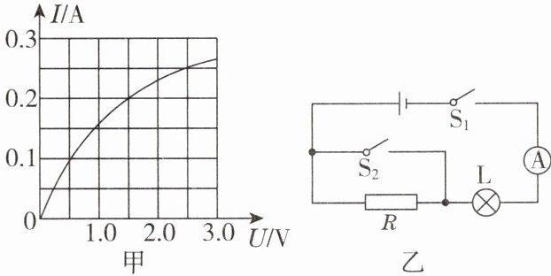 11. 小灯泡的I-U图像如图甲所示,将它与元件R接入图乙所示的电路中。只闭合开关$S_1,$电流表的示数为0.2A;再闭合开关$S_2$时,电流表的示数为0.25A。则电源电压为