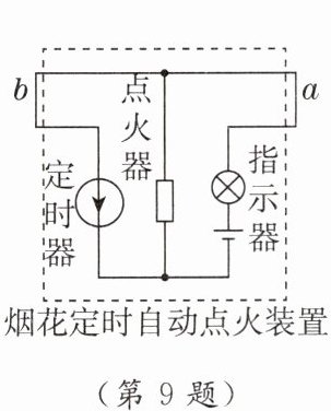 9. (生命安全)为避免点燃烟花造成人员伤害,小源设计了烟花定时自动点火装置。原理如图所示,装置中的点火器有电流通过时,就会自动点燃烟花,定时器控制点火时间。定时器在电路中相当于