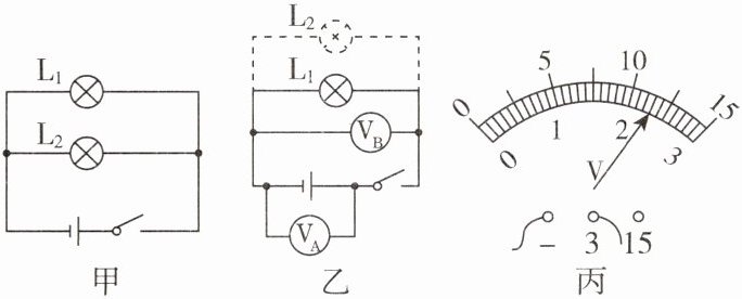 (1)当电路中有三个灯泡时,电压表$V_B$的示数如图丙所示,为______