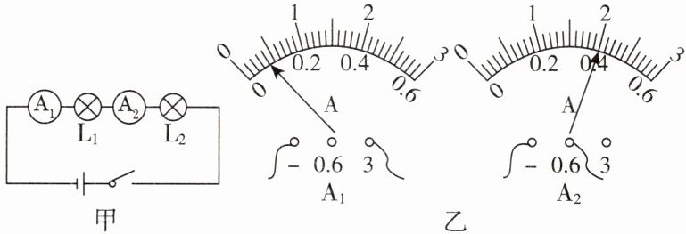 (1)第一小组的同学实验时根据电流表$A_1$指针偏转角度比$A_2$小(如图乙所示),判断“串联电路中各处的电流不相等”。请你指出造成他们判断错误的原因:______