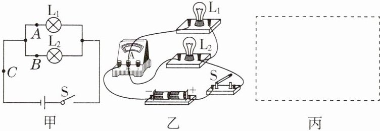 (2)(电路设计)得出正确结论后,利用图乙所示实验器材,仅添加一个开关$S_1,$重新设计电路,不用拆接导线,仅利用开关通断就可得出A、B、C三处的电流,请在图丙的虚线框中画出电路图。(导线足够)