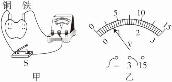 (1)物理兴趣小组的同学通过实验探究来验证猜想是否正确,在不同水果中插入不同金属制成的极板,并保持两块极板间的距离、极板插入水果的深度不变,分别测出电压,实验记录如表所示。第1次实验操作如图甲所示,闭合开关,电压表的示数如图乙所示,由此可知此时水果电池的正极为
