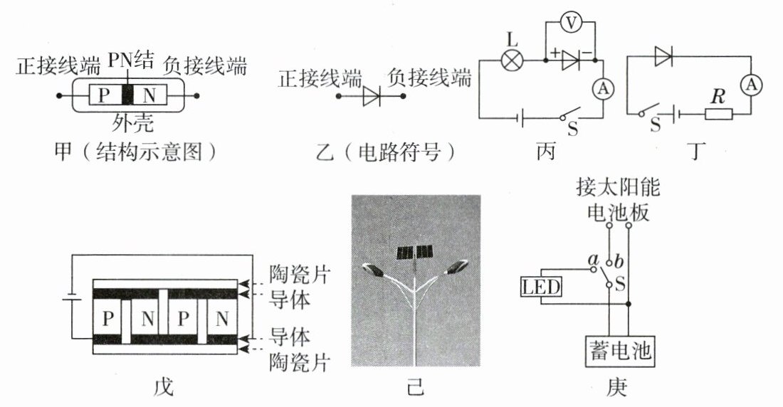 城市道路两边的太阳能路灯(如图己),由太阳能电池板、控制器、蓄电池、LED发光二极管、灯杆及灯具外壳等组成,它的结构示意图如图庚。它通过太阳能电池板独立发电并将其储存在蓄电池内,晚上供路灯(LED发光二极管)照明时使用。