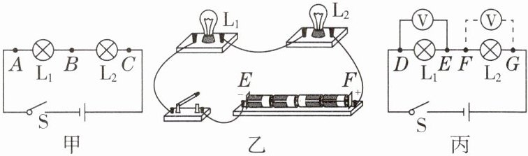 (4)小明和小刚用如图丙所示电路测量灯L₁两端的电压时,两灯突然熄灭,电压表的示数变为零。小刚再用电压表检测灯L₂两端的电压,电压表的示数等于电源电压。由此判断出,发生的故障可能是