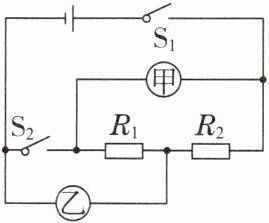 17. 科学思维 [2024·南充]如图所示电路,若甲、乙两表为电流表,闭合开关$S_{1}$,断开开关$S_{2}$,两表指针位置相同,则$R_{1}:R_{2}=$