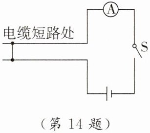 14. 已知铝芯电缆每1m长的电阻为0.02Ω(导体的材料、横截面积一定时,电阻与长度成正比)。某次输电过程中,电缆某处短路导致用户停电。为找到短路地点,工人在切断电源的情况下,以4节新干电池串联作为电源,用如图所示的电路在用户处测得电路电流为0.2A,则接入电路的电缆电阻为______