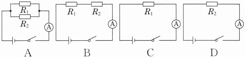 5. [2024·济宁期末]下列电路中,已知电源电压相等,且$R_{1}\lt R_{2}$,开关闭合后,电路中电流表的示数最小的是 (