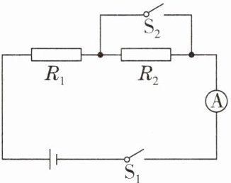 9. [2024·沧州期末]如图所示,电源电压不变,当开关$S_{1}$闭合、$S_{2}$断开时,电流表的示数为0.3A;再闭合$S_{2}$后,电流表的示数为0.9A,则电阻$R_{1}与R_{2}$的比值为 (