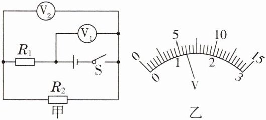 11. [2025·无锡期末改编]如图所示,当图甲电路中的开关S闭合时,两个电压表的指针位置均为如图乙所示,则电阻$R_{1}$两端的电压为