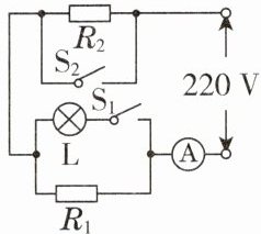 14. [2025·北京期中]冬季,养鸡场为了提高产蛋量,夜间需要在鸡舍里用电热器加热并用灯泡照明,开关$S_{1}$、$S_{2}$都闭合;白天只需要在鸡舍里用电热器加热,不需要用灯泡照明,开关$S_{1}$、$S_{2}$都断开,这段时间内电流表的示数为5.5A。小阳根据上述要求设计了一种加热照明装置,这个装置的电路图如图所示,电阻$R_{1}和R_{2}$是两个用来加热且阻值不变的电阻丝,灯L是阻值为242Ω的照明灯泡(不考虑灯丝电阻随温度的变化),已知:电源两端的电压U恒为220V,$R_{1}= 10Ω$。