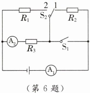 6. [2024·江西]如图所示,三个电阻$R_{1}$、$R_{2}$、$R_{3}$的阻值均相同,开关$S_{1}$断开、开关$S_{2}$掷到1,电流表$A_{1}与电流表A_{2}$的示数之比为