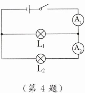 4. [2025·菏泽期中]如图所示的电路中,两个电流表均为实验室里常用的电流表,闭合开关后,两电流表的指针偏转相同的角度,此时通过灯$L_{1}和L_{2}$的电流之比为