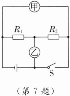 7. [2025·青岛期中]如图所示,当开关S断开,甲、乙两表为电流表时,示数之比$I_{甲}:I_{乙}= 2:5$,则$R_{1}与R_{2}$的阻值之比为
