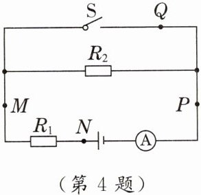 4. (科学推理)在如图所示的电路中,电源电压保持不变,电阻$R_{1}$、$R_{2}$均为定值电阻。若在电路中添加一个电压表,闭合开关S前后,发现电压表与电流表示数的比值不变,则电压表并联的位置(