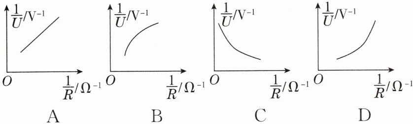A 点拨:由电路图知,闭合开关后,定值电阻 $ R_{0} $ 与电阻箱 $ R $ 串联,由欧姆定律可得,电路电流 $ I = \frac{U_{\text{总}}}{R + R_{0}} = \frac{U}{R} $,则电压表示数 $ U = \frac{U_{\text{总}} R}{R + R_{0}} $,则 $ \frac{1}{U} = \frac{R + R_{0}}{U_{\text{总}} R} = \frac{1}{U_{\text{总}}} + \frac{R_{0}}{U_{\text{总}}} \times \frac{1}{R} $,因 $ U_{\text{总}} $、$ R_{0} $ 为定值,所以 $ \frac{1}{U} - \frac{1}{R} $ 之间的关系是一次函数关系,由图像可知A正确。