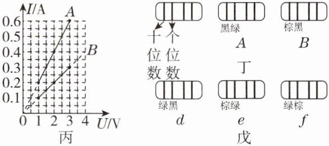 (3)由图丙可知,导体 $ B $ 两端的电压 $ U_{B} = 3 \text{ V} $ 时,对应电流 $ I_{B} = 0.3 \text{ A} $,则电阻 $ R_{B} = \frac{U_{B}}{I_{B}} = \frac{3 \text{ V}}{0.3 \text{ A}} = 10 \Omega $;同理导体 $ A $ 两端的电压 $ U_{A} = 3 \text{ V} $ 时,对应电流 $ I_{A} = 0.6 \text{ A} $,则电阻 $ R_{A} = \frac{U_{A}}{I_{A}} = \frac{3 \text{ V}}{0.6 \text{ A}} = 5 \Omega $;图丁中 $ A $ 的阻值为 $ 5 \Omega $,则十位为 $ 0 $,个位为 $ 5 $,因此黑色环代表 $ 0 $,绿色环代表 $ 5 $,同理 $ B $ 的阻值为 $ 10 \Omega $,则棕色环代表 $ 1 $,因此选择 $ 15 \Omega $ 的电阻就是十位是棕色环,个位是绿色环,即 $ e $ 为 $ 15 \Omega $ 电阻。
