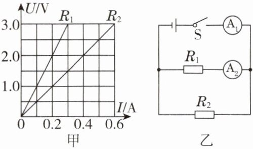 9. 如图甲所示是定值电阻$R_{1}和R_{2}$的U-I图像,将它们并联接在如图乙所示电路中,若电源电压恒为4 V,闭合开关S,则电流表$A_{2}$的示数为