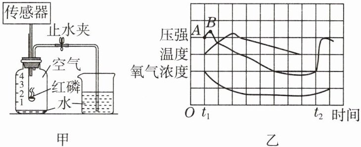 2. 老师利用图甲装置测定空气中氧气的含量并结合现代传感器技术,测得过程中容器内气体压强、温度、氧气浓度的变化趋势如图乙所示。