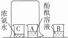 7. 小李同学按照课本实验,探究分子的性质,如图所示。向烧杯C中加入约5mL浓氨水,用一个大烧杯罩住A、C两个小烧杯,烧杯B置于大烧杯外。观察几分钟,烧杯A、B中的现象分别是______。这一现象说明:______。B烧杯的作用是______。