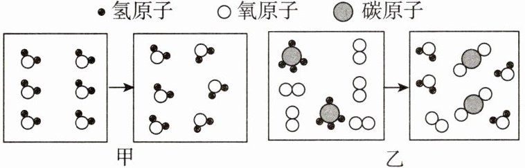 D 点拨:乙变化过程中反应物有两种物质,生成物有两种物质,不属于化合反应,A错误;甲变化中只有${H_{2}O}$一种物质,且甲变化为物理变化,B错误;甲为物理变化,原子和分子种类不变,乙为化学变化,分子种类改变,原子种类不变,C错误;甲、乙两个变化后的物质中都含有水分子,D正确。