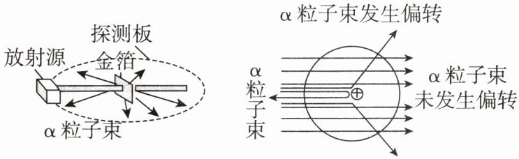 【收集证据】绝大多数α粒子(带正电的氦原子核)穿过金箔后仍沿原来的方向前进,只有少数α粒子发生了较大的偏转,并且有极少数α粒子的偏转超过90°,有的甚至几乎达到180°,像是被金箔弹了回来。