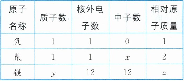 (1)相对原子质量≈中子数+质子数,则有$2=1+x,x=1$;在原子中质子数=核外电子数,则$y=12$;相对原子质量≈中子数+质子数,则有$z=y+12=12+12=24$。