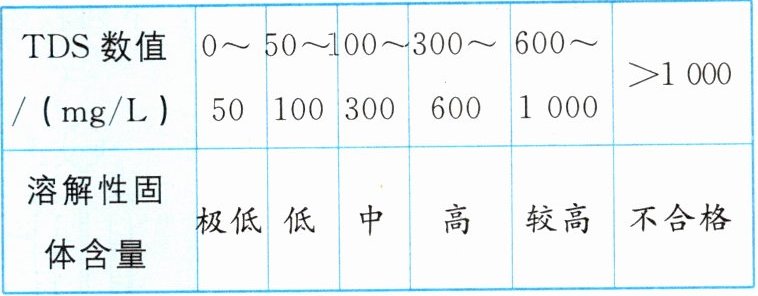 【TDS(总溶解性固体物质)检测】(2)TDS是初步判断水质好坏的一种简单直观的方式。一般情况下,TDS值越低,表明水中的溶解性固体越少,水质越纯;生活饮用水的标准是TDS值$\leqslant 1000mg/L$,TDS值与水质的关系如表所示。
