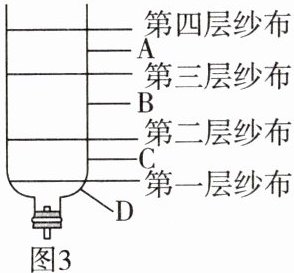【进行实验】(1)根据方案中的装置,用小刀去掉饮料瓶瓶底,在饮料瓶中依次放入几种填充材料,每种物质间用纱布隔开,每放一层都稍稍压实。瓶盖上打孔,插入一段吸管。