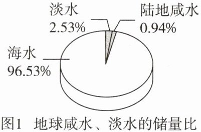 【查阅资料】地球上的总水量虽然很大,但淡水很少(如图1所示),约占地球水储量的____。