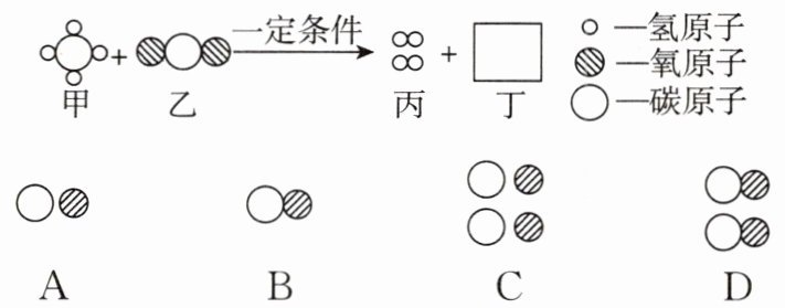 10. 2024北京 为实现“双碳”目标,我国积极推动能源绿色低碳安全高效转型。$CH_{4}与CO_{2}在一定条件下反应生成H_{2}和CO$,该制氢反应的微观示意图如图所示。图中丁的微观图示为 ()