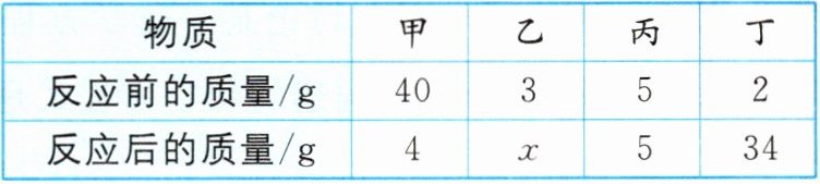 C 点拨:由表中数据分析可知,反应后甲的质量减少了$40g-4g=36g$,则甲是反应物,参加反应的甲的质量为 36 g;反应前后丙的质量不变,可能是该反应的催化剂,也可能是无关杂质,B 正确;丁是生成物,生成丁的质量为$34g-2g=32g$;由质量守恒定律知,乙应是生成物,且生成乙的质量为$36g-32g=4g$,故x的数值为$3+4=7$,A 正确;该反应的反应物为甲,生成物是乙和丁,属于分解反应,C 错误;反应中甲和丁的质量比是$36g:32g=9:8$,D 正确。