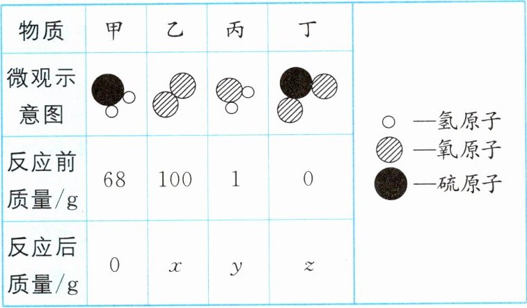 D 点拨:由反应的微观示意图可知,该反应是硫化氢燃烧生成水和二氧化硫,上述反应的化学方程式为2H₂S + 3O₂$\xlongequal{点燃}$2H₂O + 2SO₂;生成物有两种,不属于化合反应,故A错误;丁是二氧化硫,S、O两种元素质量之比为32:(16×2) = 1:1,故B错误;由质量守恒定律可知,反应生成的物质总质量为(y + z - 1)g,故C错误;