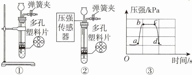 10. 跨学科综合 用图①所示装置制取二氧化碳的优点是可以控制反应的发生和停止,为了解装置具有此优点的原因,同学们在装置中连接压强传感器(如图②所示),从而测定实验中试管内气体压强变化的情况(如图③所示),下列说法错误的是()
