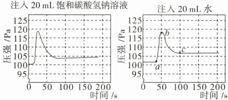 11. 2025江苏常州期末 向2个装满二氧化碳气体(130mL)的瓶中,分别注入20mL饱和碳酸氢钠溶液和蒸馏水,用压强传感器测瓶内压强变化如图所示。下列说法错误的是()