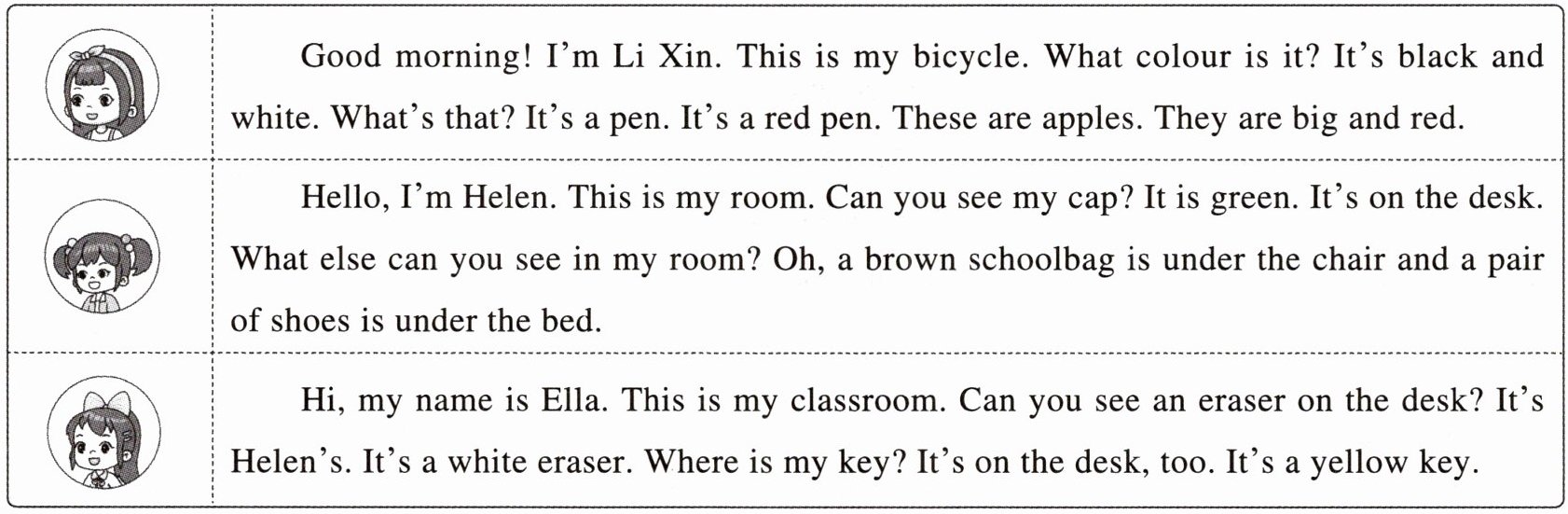 12. C 【点拨】细节理解题。根据“Ella”的描述“Where is my key? It's on the desk, too. It's a yellow key.”可知,Ella 有一把黄色钥匙,C 选项正确,故选 C。