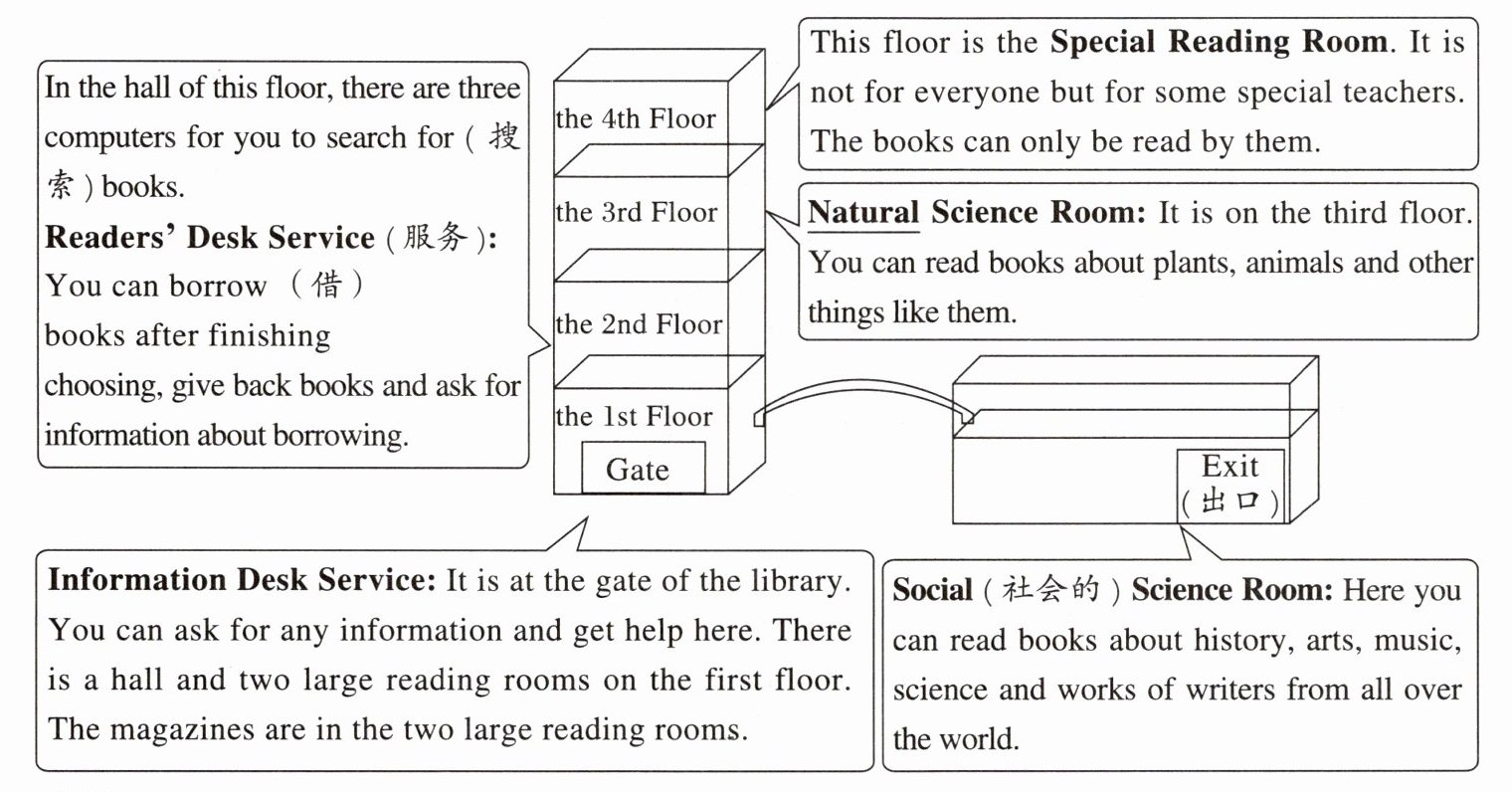 16. B【点拨】细节理解题。根据“the 2nd Floor”中的“In the hall of this floor, there are three computers for you to search for (搜索) books.”可知,在二楼,你能在互联网上搜索书籍,故选 B。