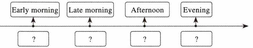 ) 34. 新考法·逻辑排序 Read the following events and put each event in the right box under the time line. Which one is right?① Bingo goes to the sheep's house and leads them to the fields.