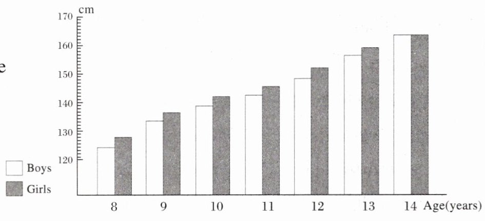 It is true that from the ages of about 8 to 14 most girls are a little taller than most boys. The graph (图表) can show you the difference in height between boys and girls. Most boys catch up with girls around the age of 14. Then they start getting taller than most girls! I'm sorry I can't tell you when you will grow. Everyone is different.