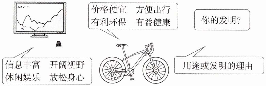 The TV provides us with different kinds of information so that we can know more about the world. We can also watch entertainment programs to relax ourselves. The bicycle is very useful, too. We go to school or work by bike. It's so cheap that most of us can afford it. It makes no pollution, which is good for the environment. What's more, riding a bicycle is a kind of exciting sport which is quite good for our health.